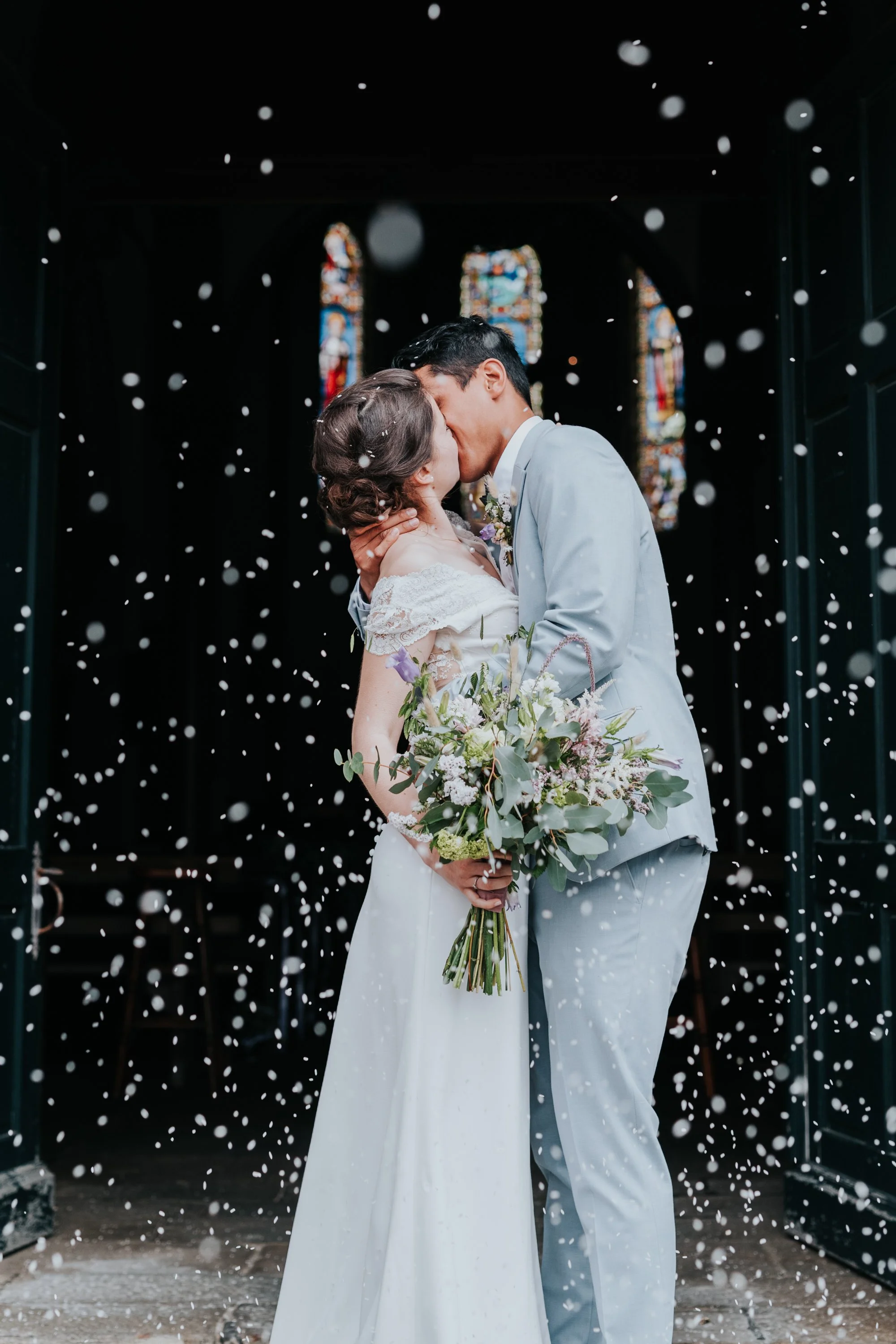 Un couple de mariés s'embrassant dans l'église, entourés de confettis.