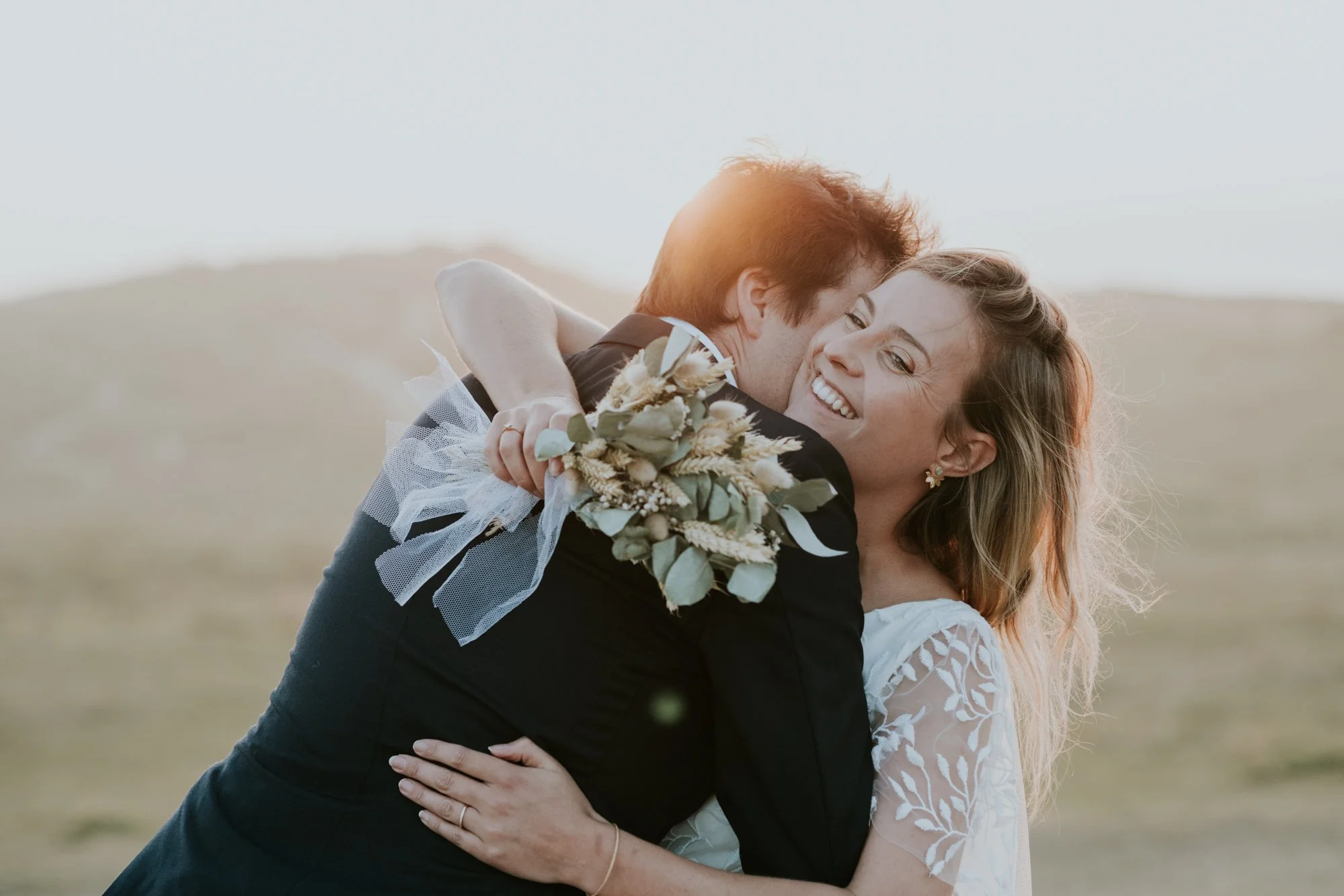 Un couple souriant s'embrassant dans un champ lors d'un coucher de soleil, elle porte une robe blanche et lui un costume noir, elle tient un bouquet de fleurs