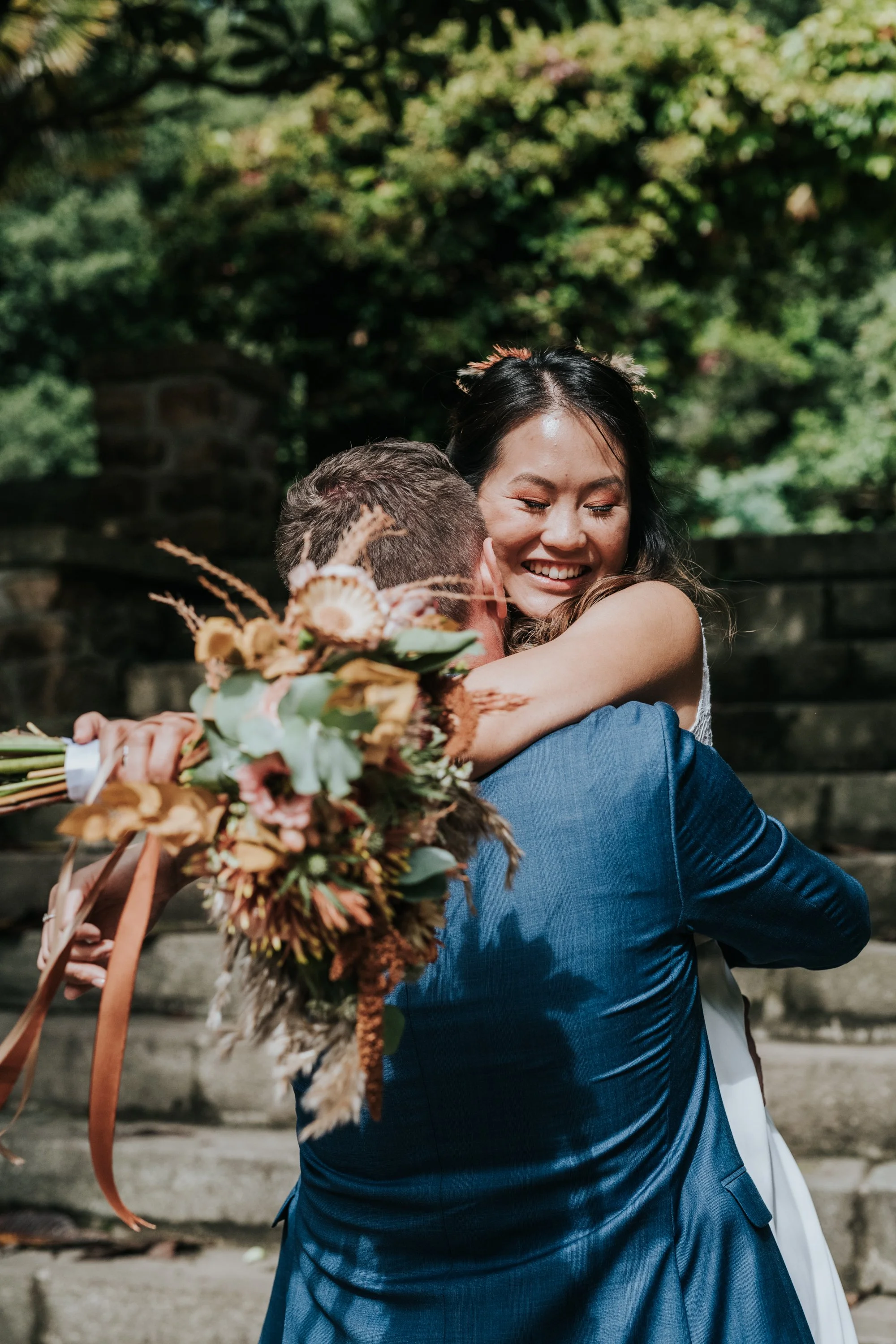 Un couple célébrant leur mariage en plein air, avec la mariée qui serre le marié dans ses bras en souriant. La mariée tient un bouquet de fleurs aux couleurs automnales.