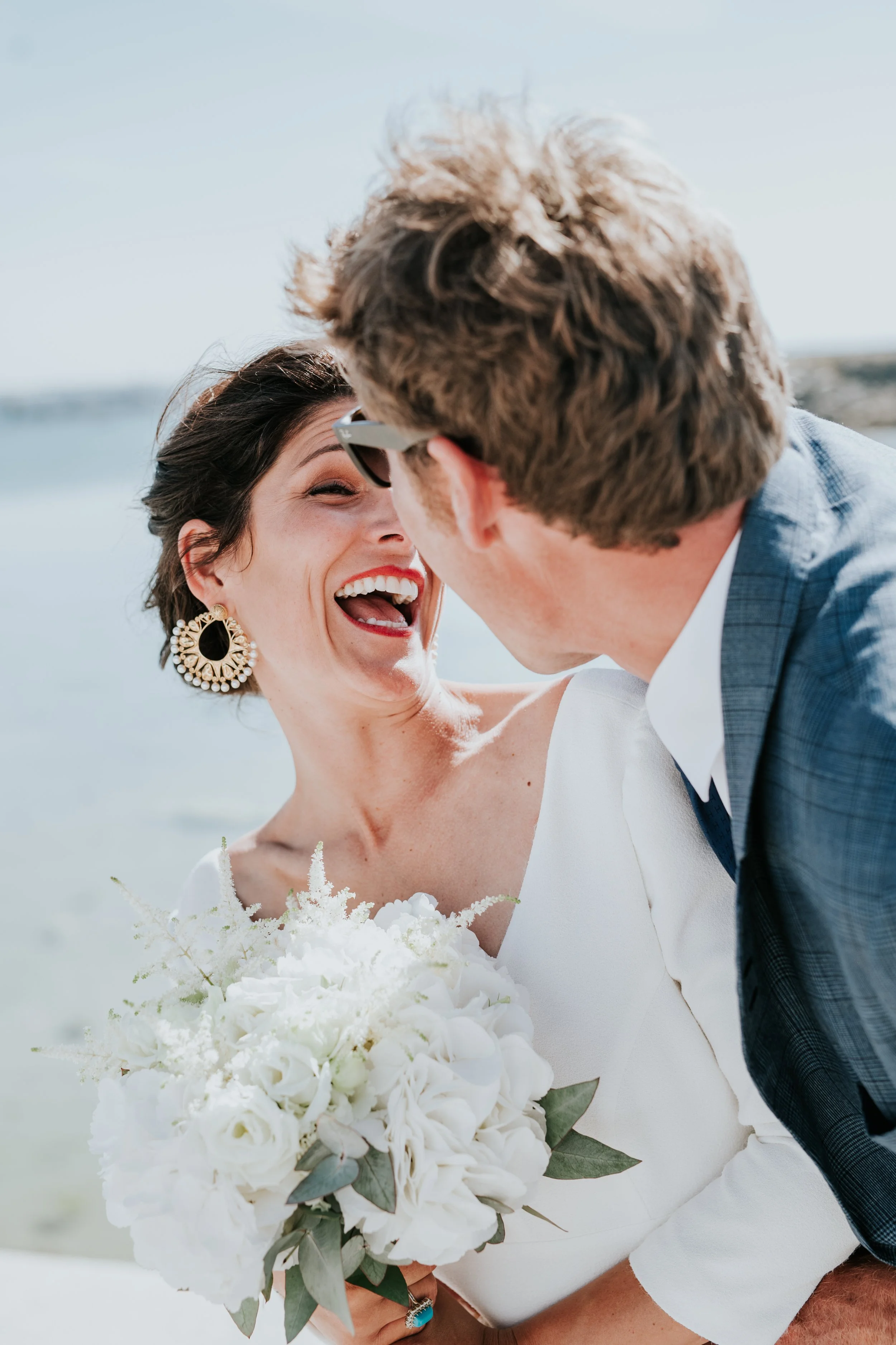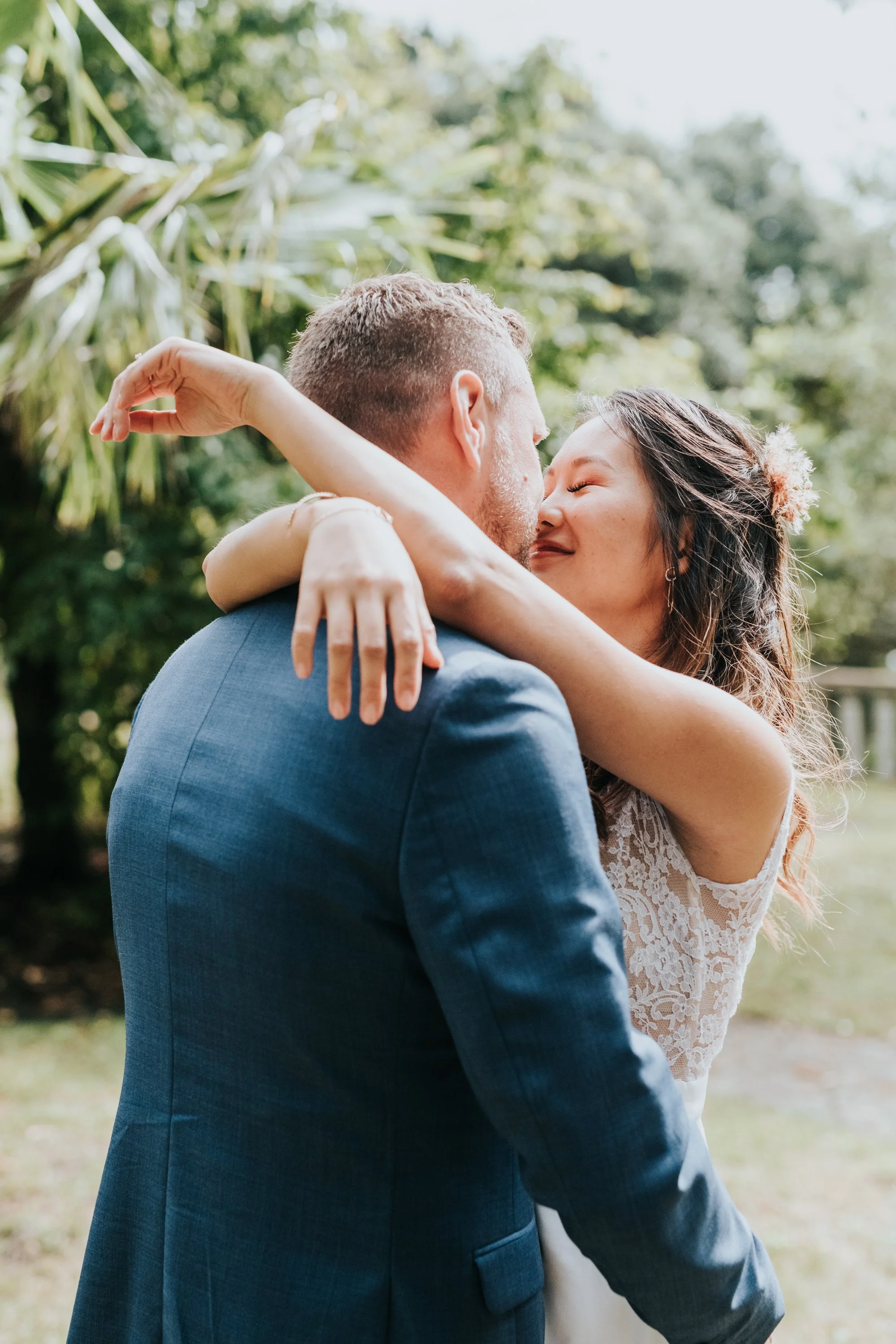 Un couple de mariés qui sourient et s'embrassent lors de leur mariage en extérieur