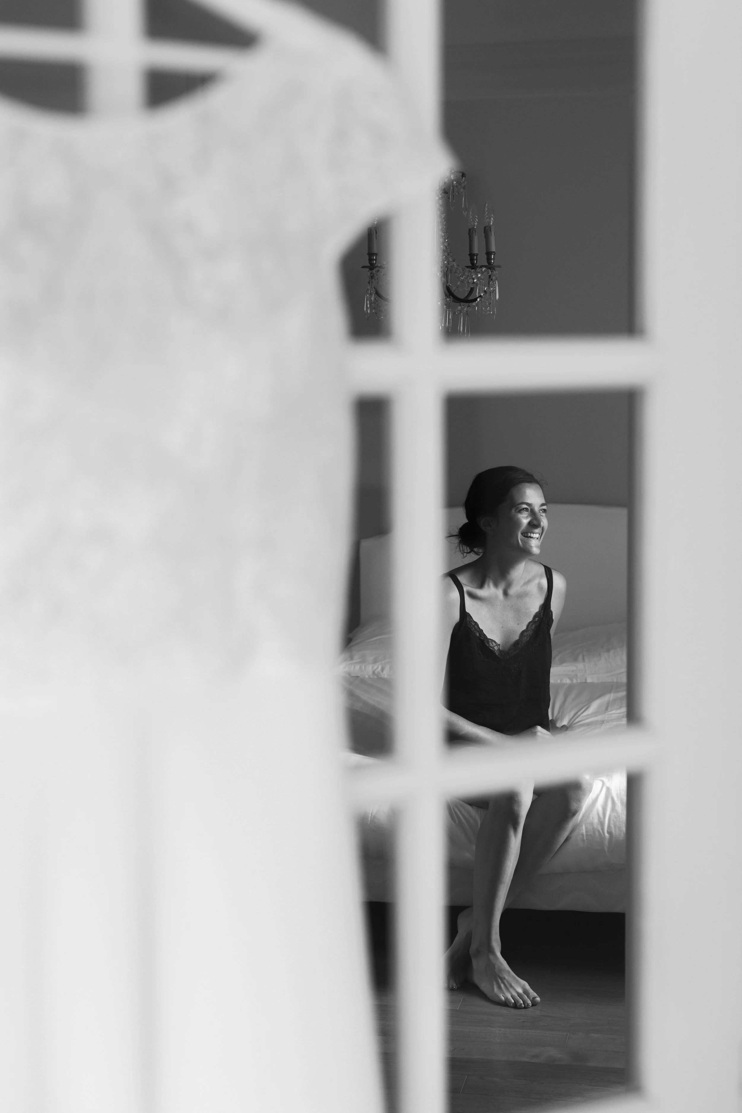 Une femme assise sur un lit, regardant à droite avec un sourire, vue à travers une fenêtre ou une porte en verre.