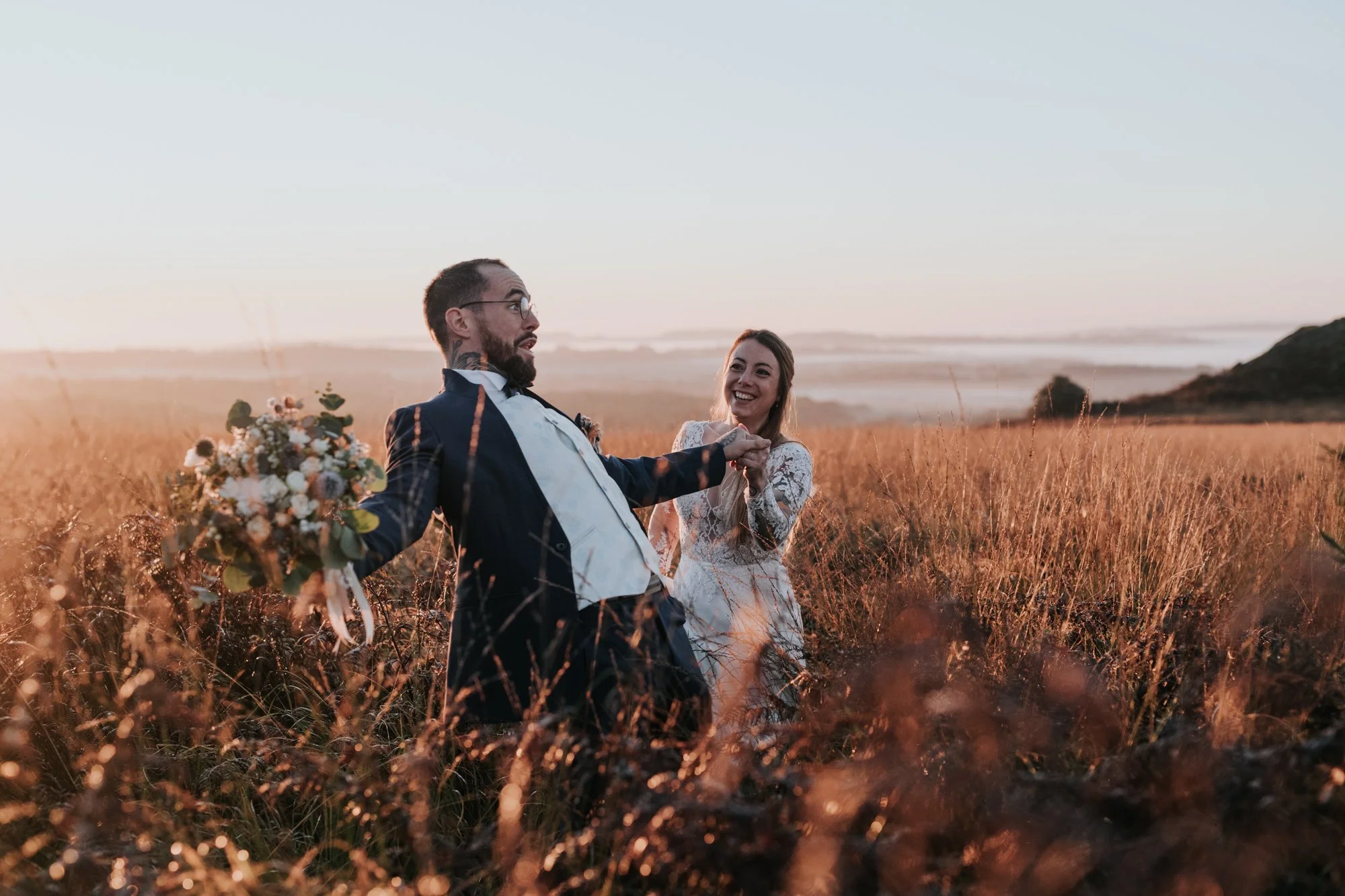 Un couple de mariés danse dans un champ au coucher du soleil, l'homme tient un bouquet de fleurs, la femme sourit.