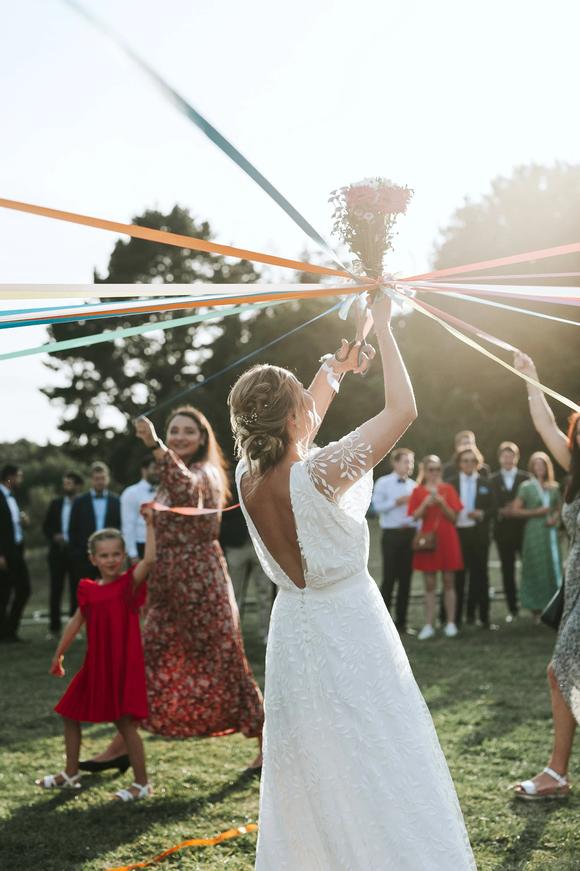 Fête en plein air avec une femme en robe blanche de mariage tenant un bouquet de fleurs, entourée de personnes dansant sous des rubans colorés.