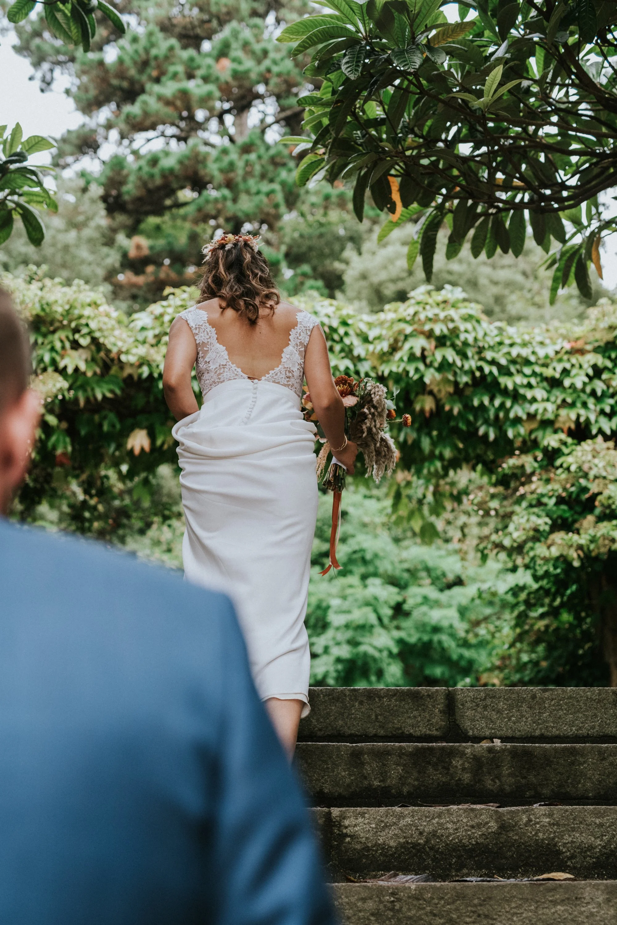 Une femme en robe de mariage blanche descend des escaliers en pierre dans un jardin vert lush, entourée de plantes et d'arbres.