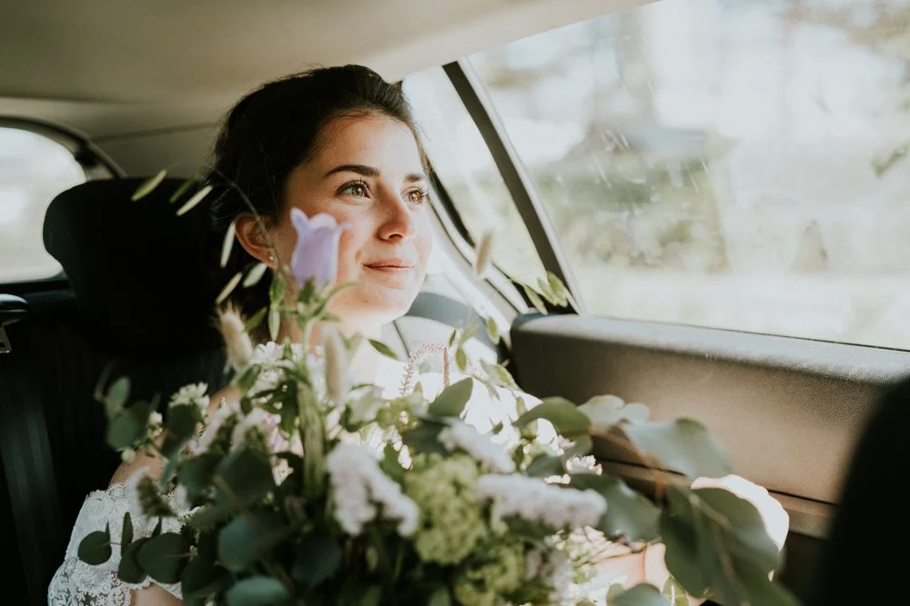 Jeune femme souriante regardant par la fenêtre, tenant un bouquet de fleurs dans un véhicule.