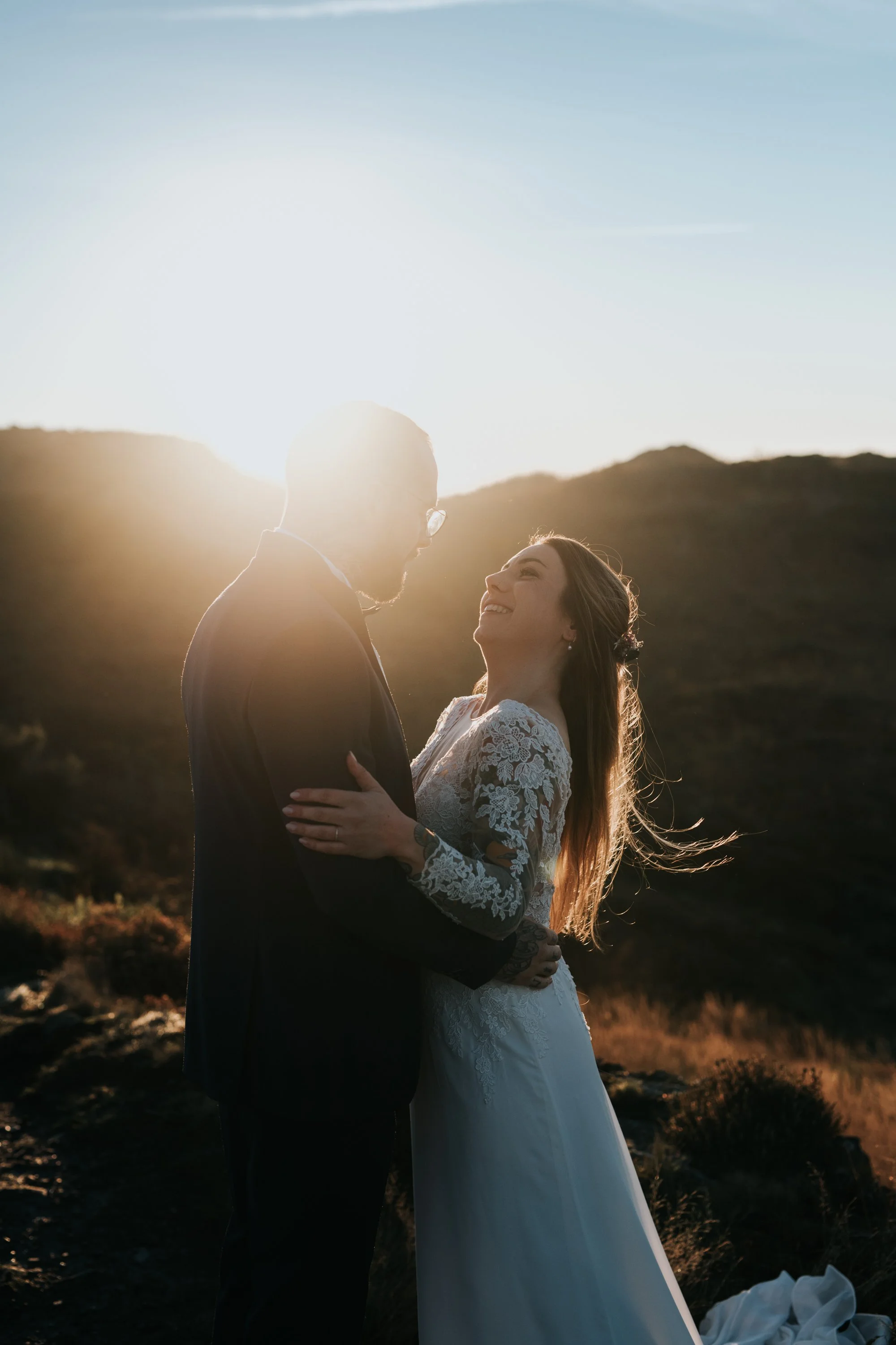 Un couple en mariage, le man en costume noir et la femme en robe de mariée en dentelle, partage un moment d'amour en plein air avec le soleil couchant en arrière-plan, dans un paysage de collines.