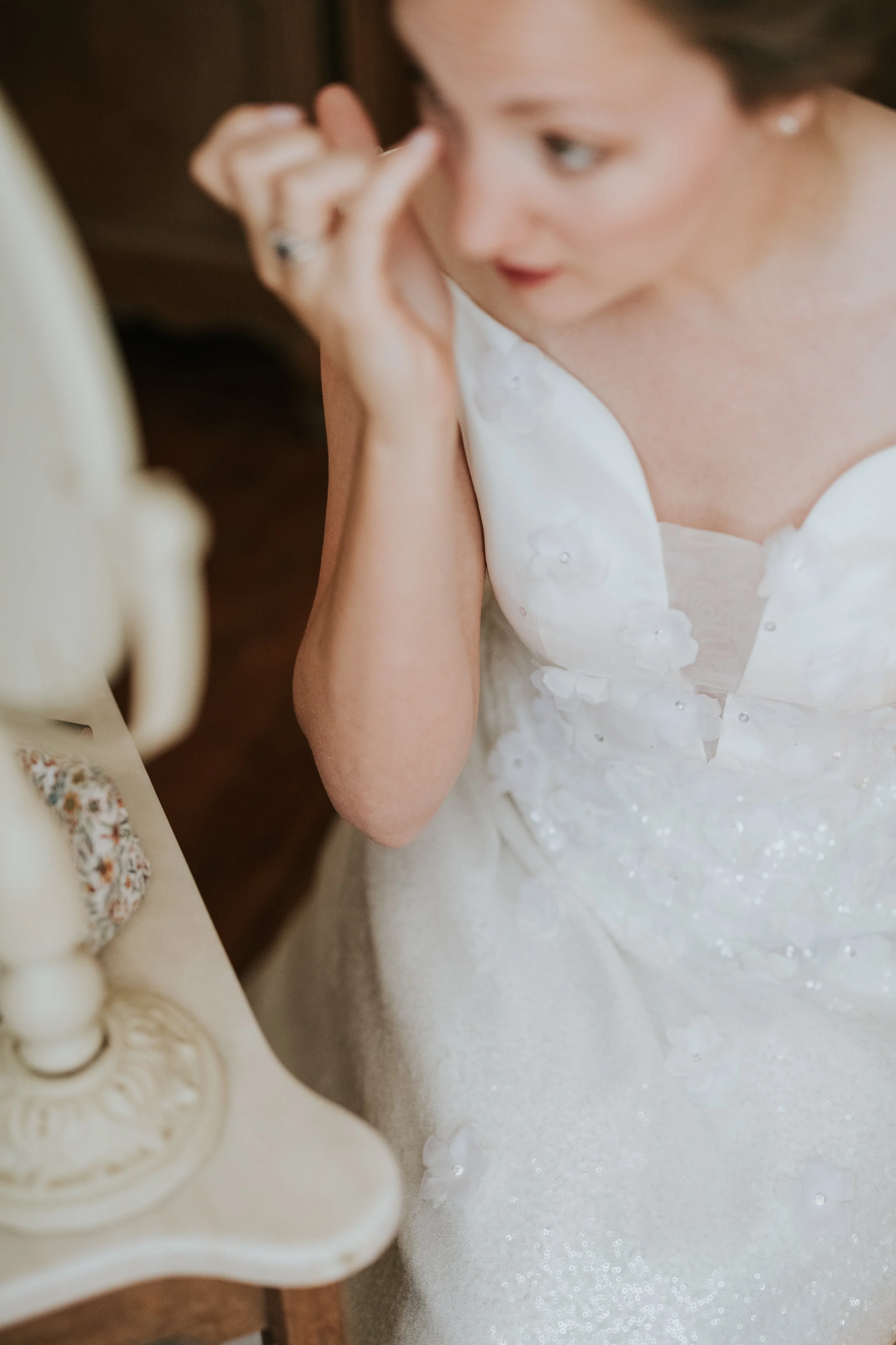 Une femme en robe de mariage en train de se coiffer ou de se préparer, vue de haut.