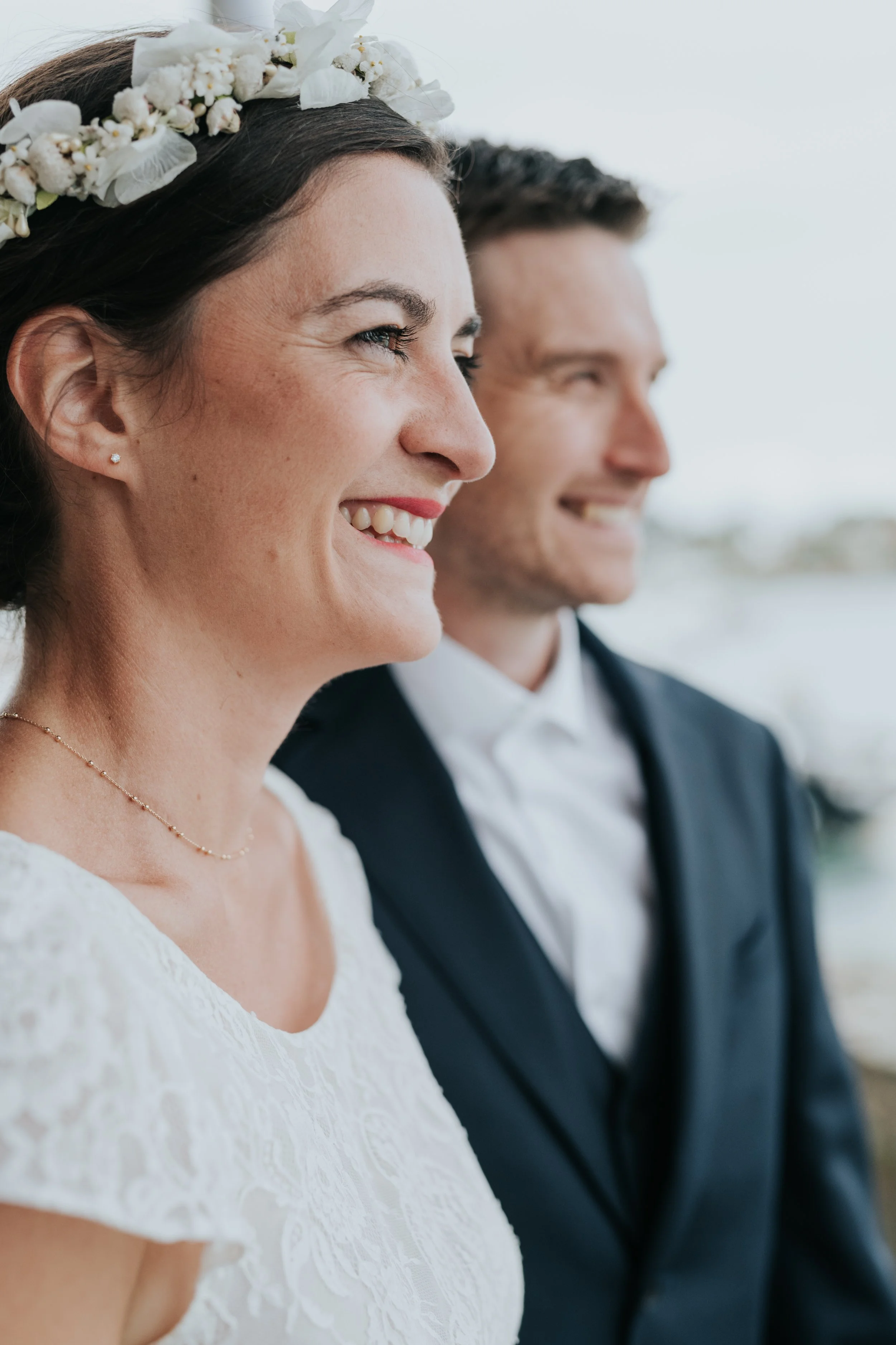 Un couple de mariés en gros plan, souriant et se rapprochant, avec une mariée portant une couronne de fleurs blanches.
