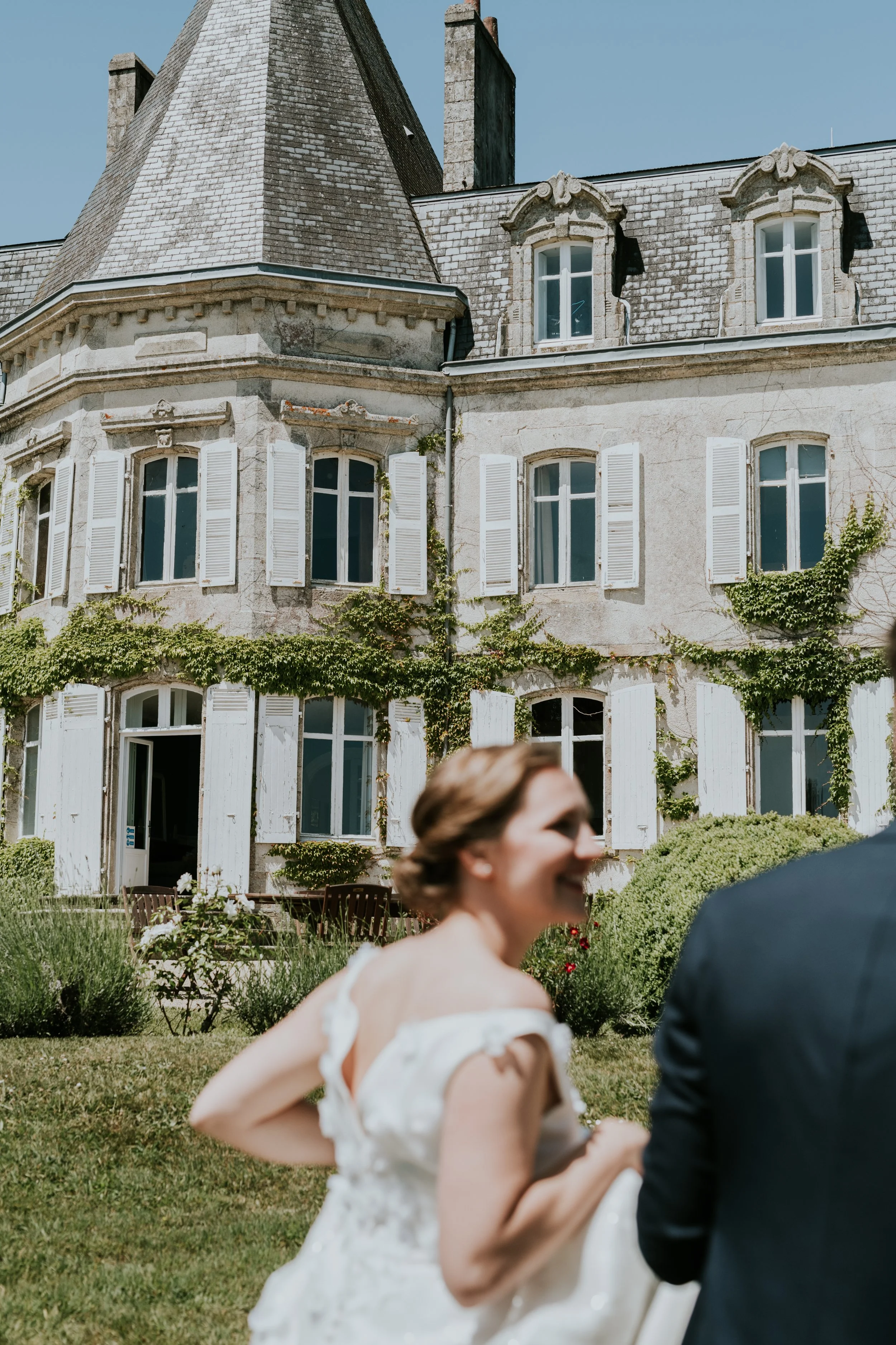Une femme en robe de mariée souriant à côté d'un homme, devant une grande maison ancienne avec volets en bois blanc, murs en pierre, et végétation grimpante.